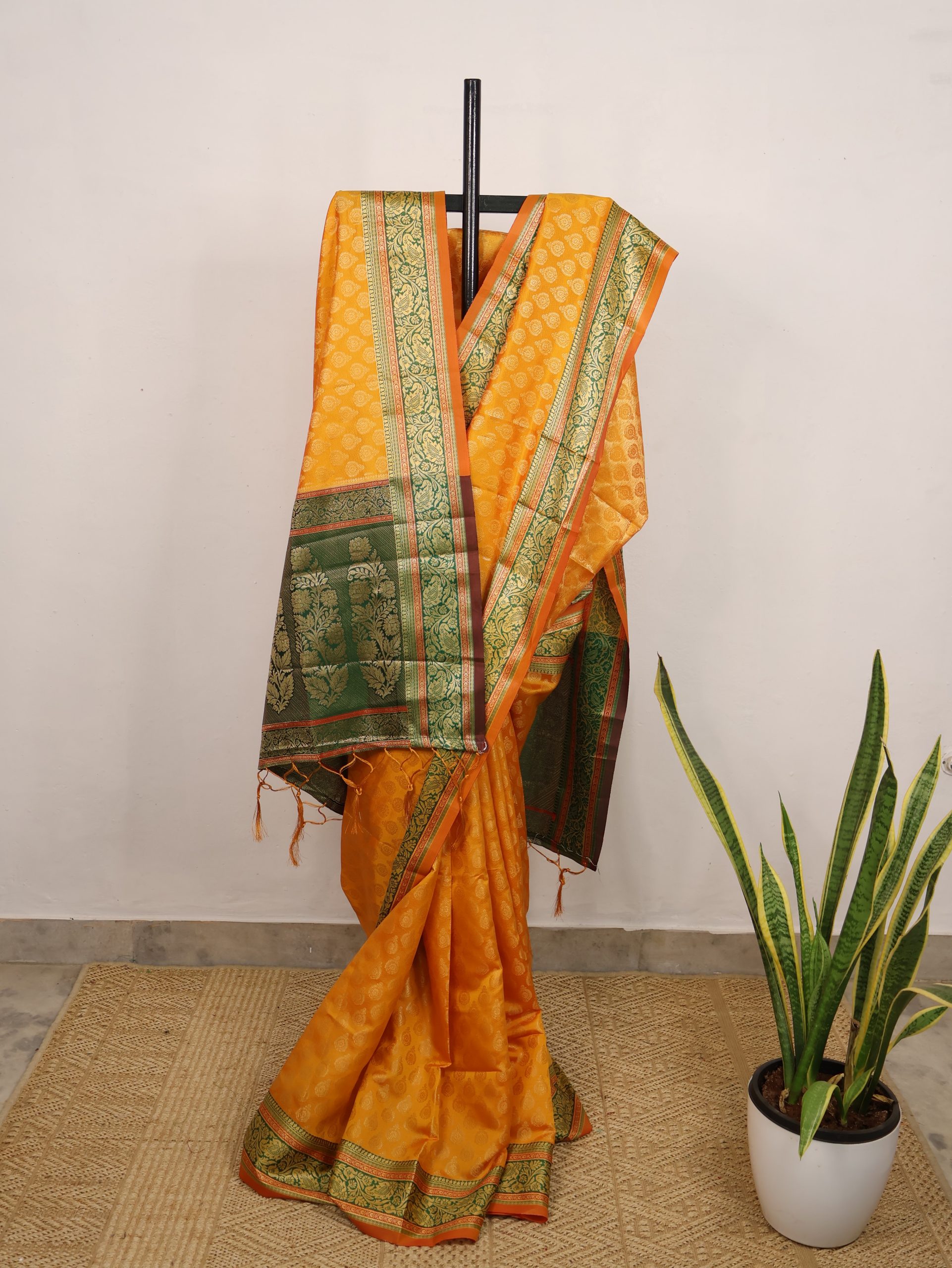 Mango Yellow & Green Semi-Banarasi Saree