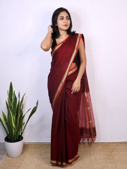 Home Sarees Mul Mul Sthree Cocoa brown with red border saree