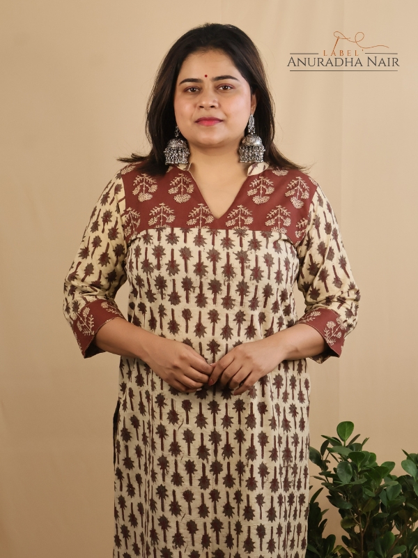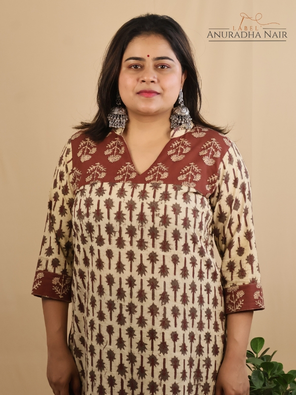 Cream & Brown Vanaspathi Ajrakh Handblock  kurti