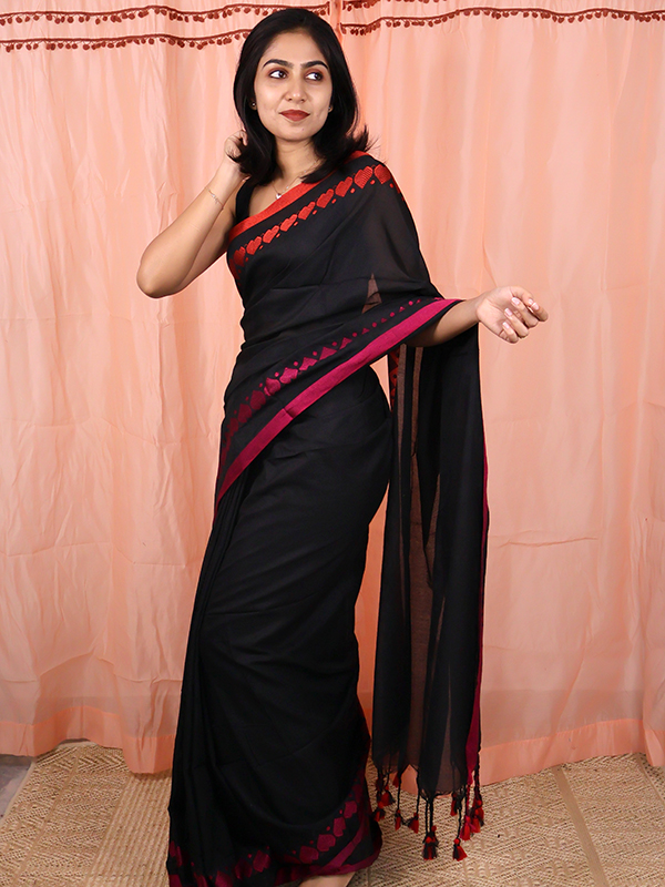 Home Sarees Mul Mul Dhadak Black With Red & Pink Dhadak Saree