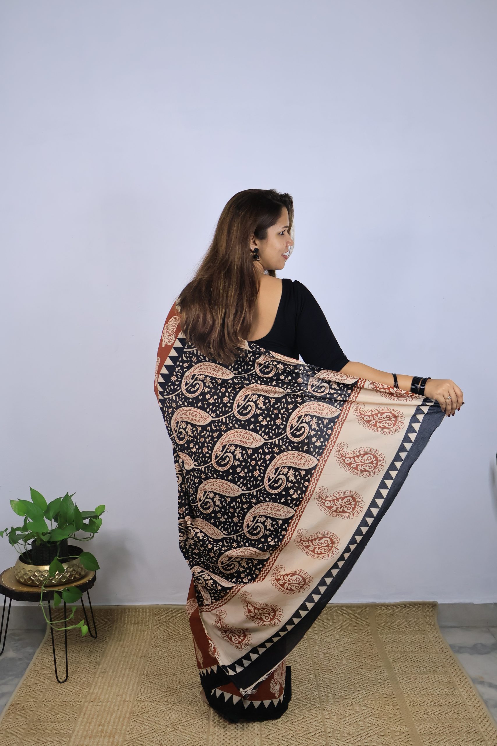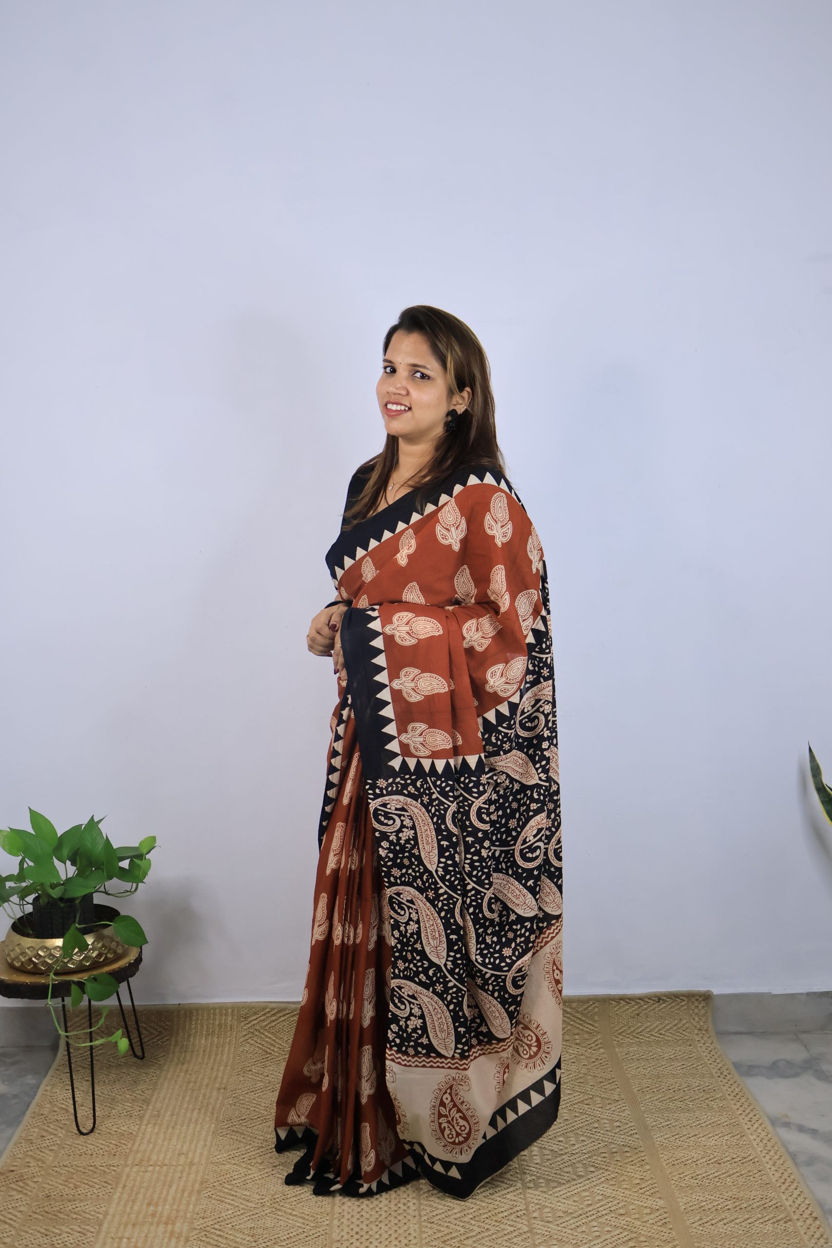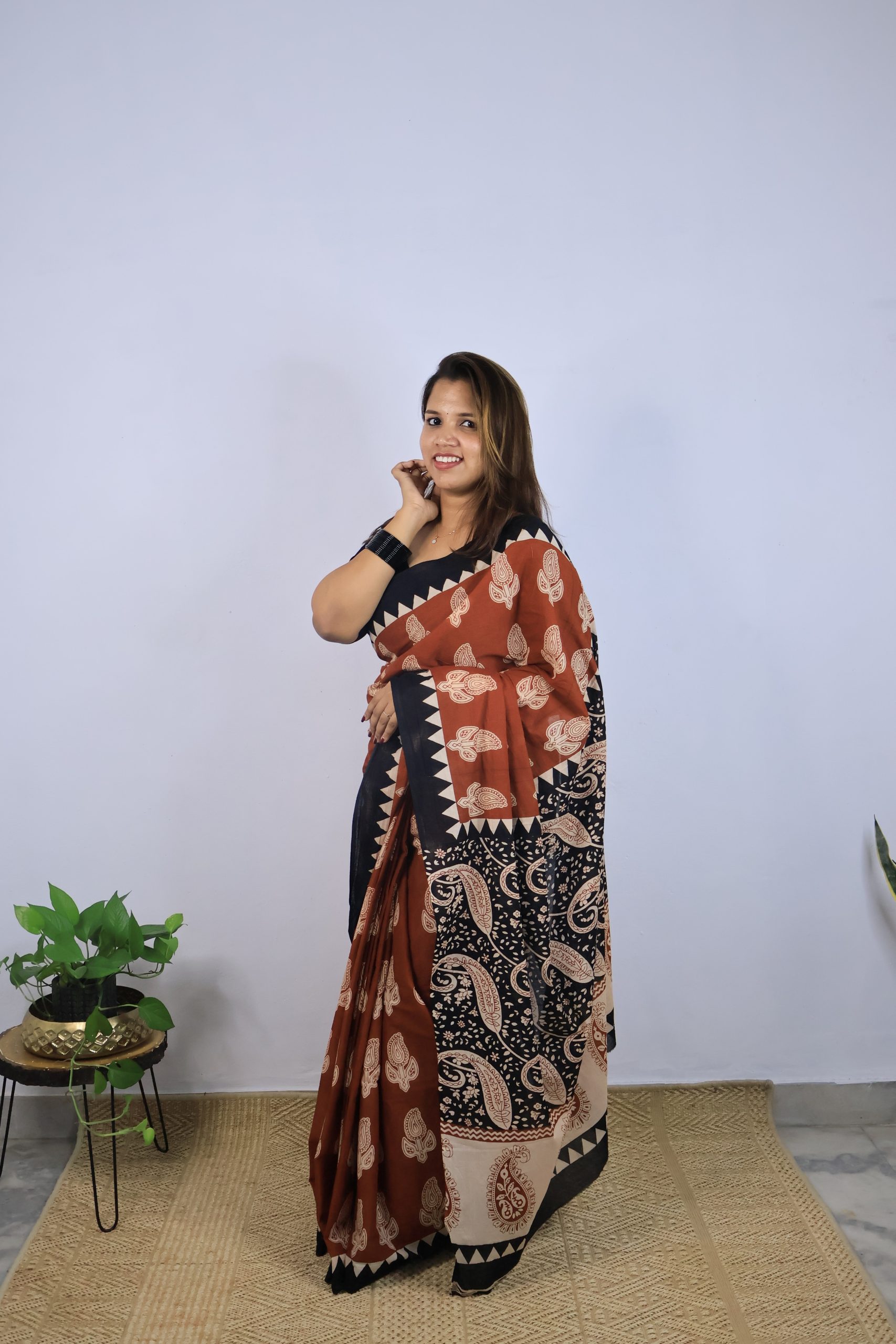 Home Sarees Mul Mul Jaipuri Kahani Brick-Red Off-White & Black Jaipuri Kahani Saree