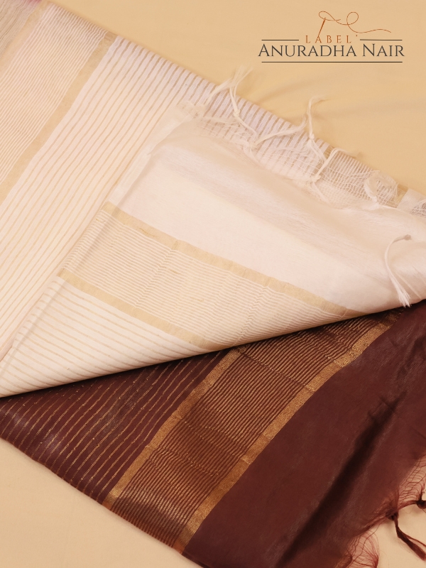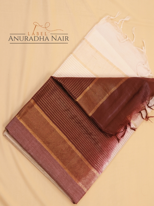 Brown & Cream Semi Tussar Slub Saree With Lines