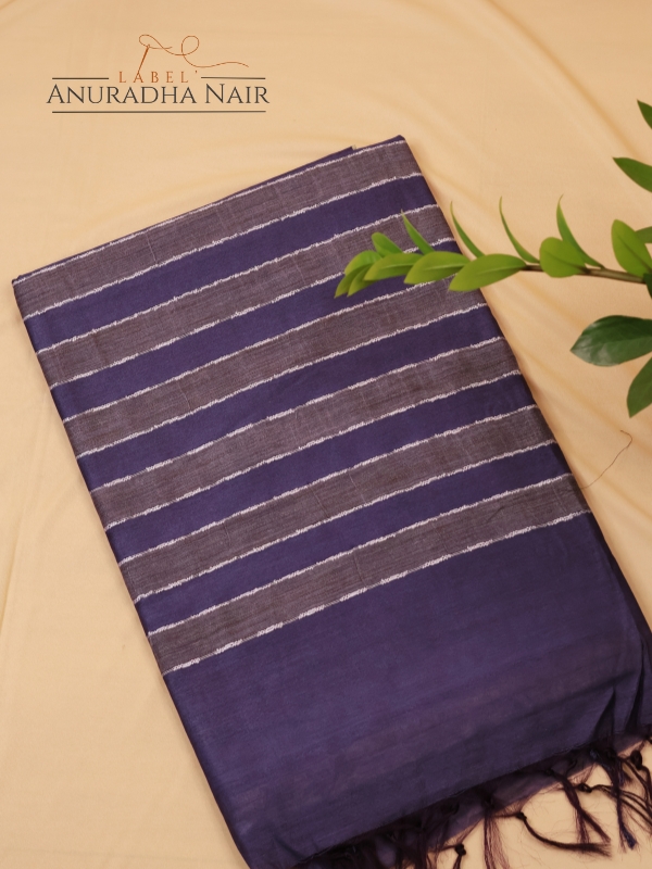 Dark Blue & Grey Semi Tussar Slub Saree With Lines