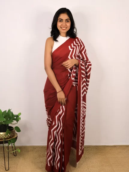 Maroon & white Jaipuri Kahani Saree