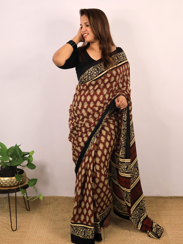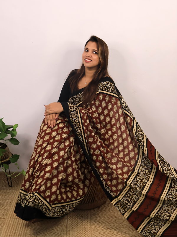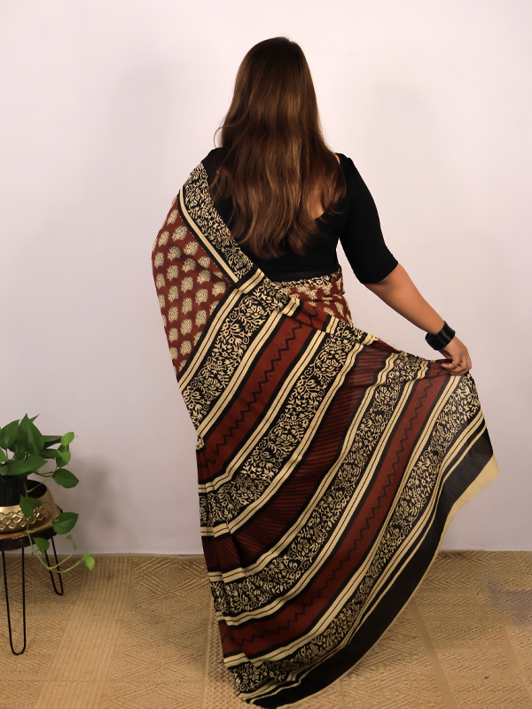 Home Sarees Mul Mul Jaipuri Kahani Maroon, Black & Off-white Jaipuri Kahani