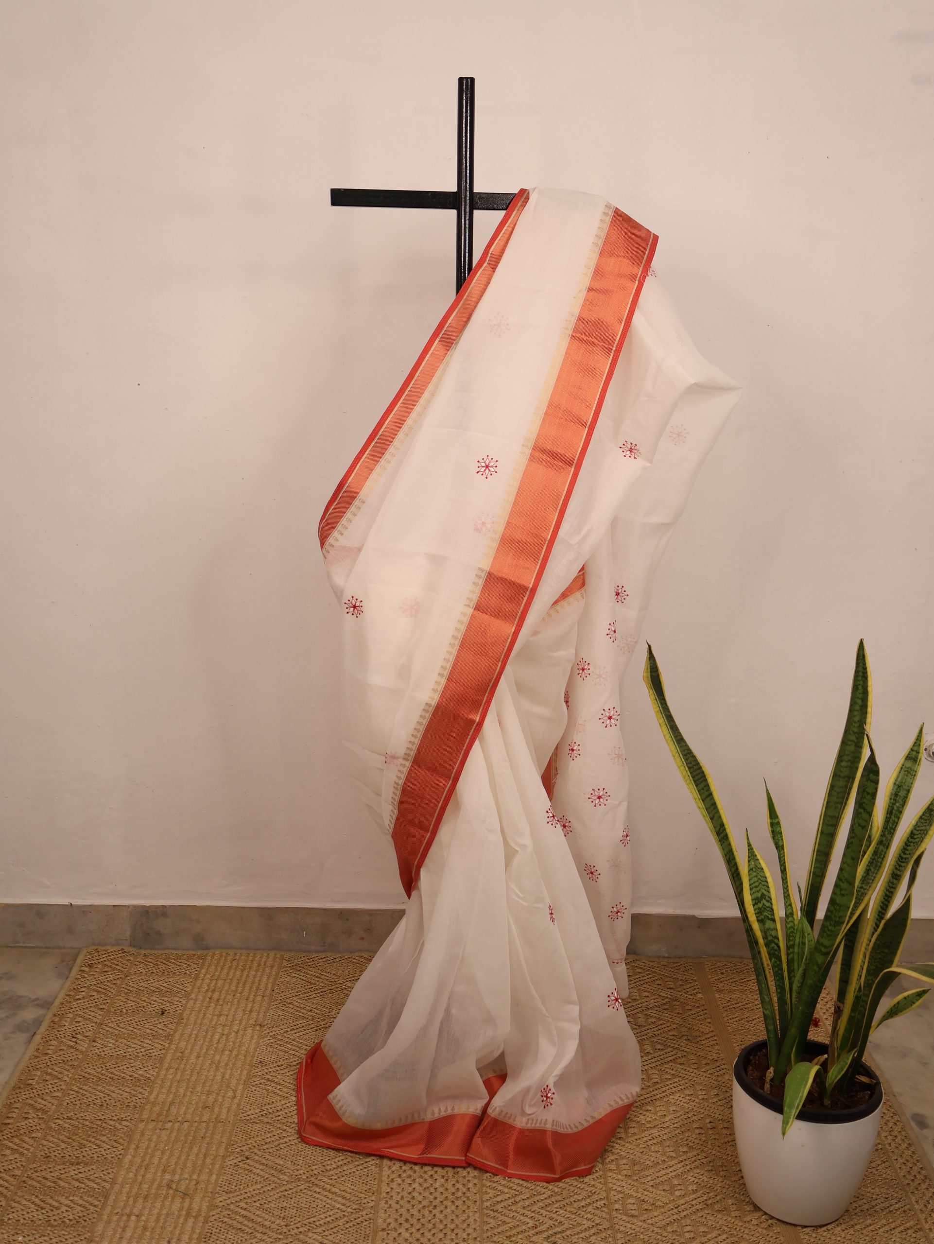 Home Sarees Chanderi Cotton White & Red Semi-Chanderi Saree