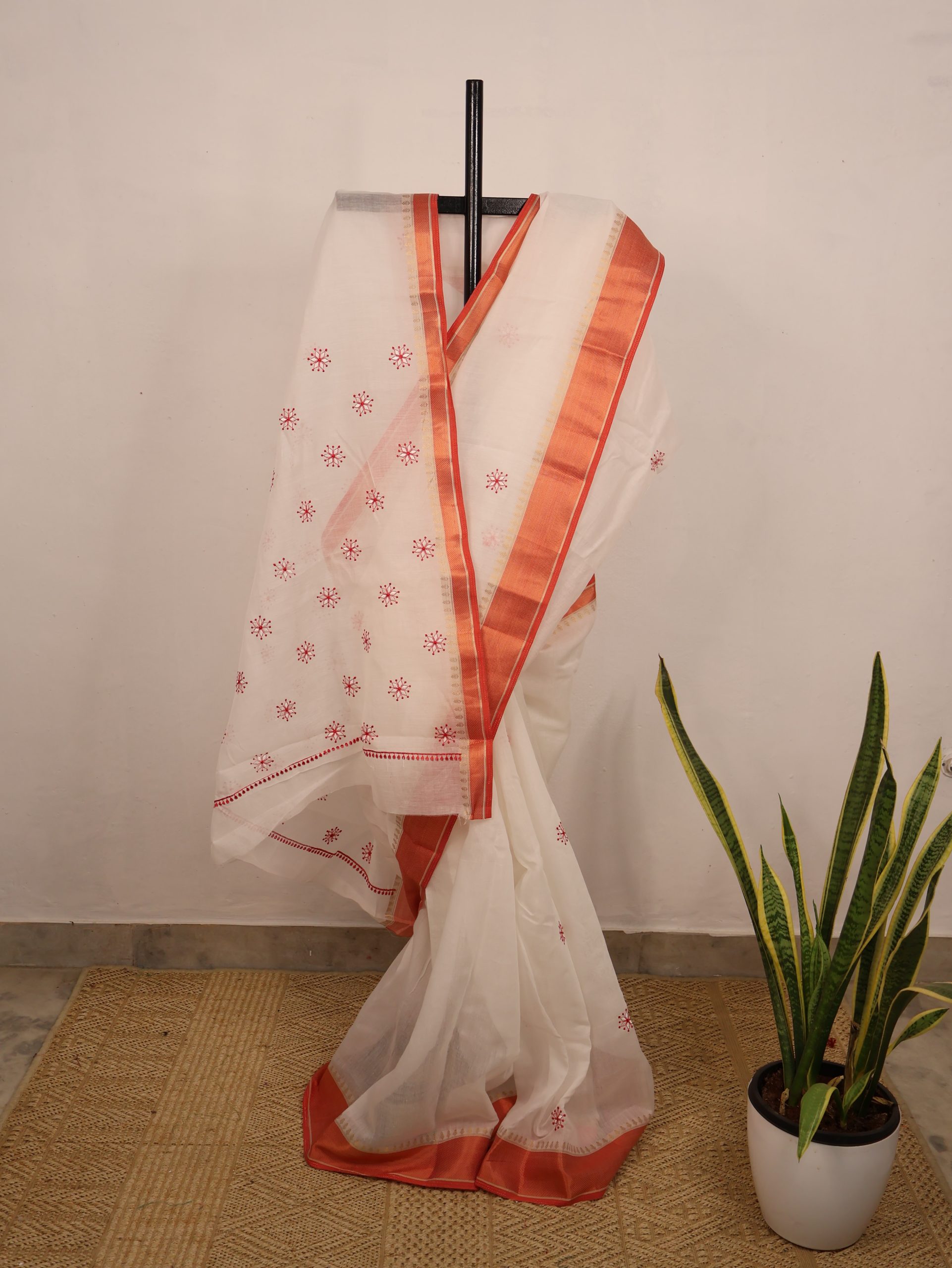 White & Red Semi-Chanderi Saree