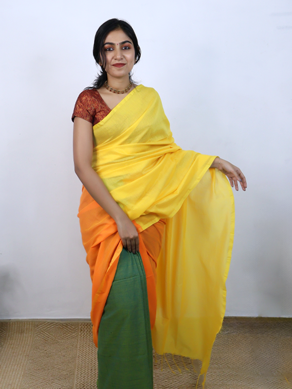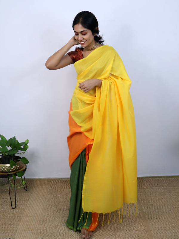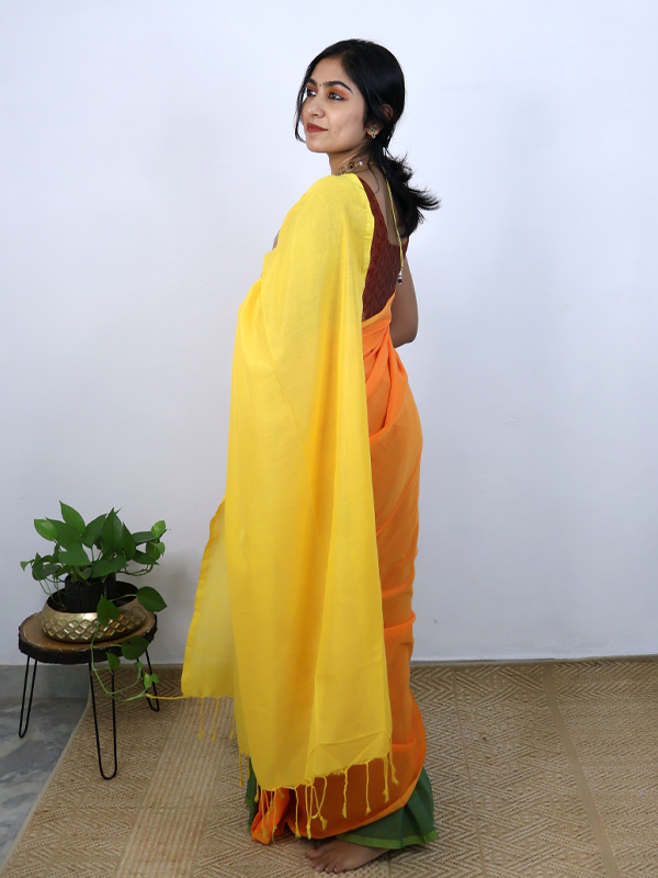 Home Sarees Mul Mul Sthree Yellow, orange & olive green saree