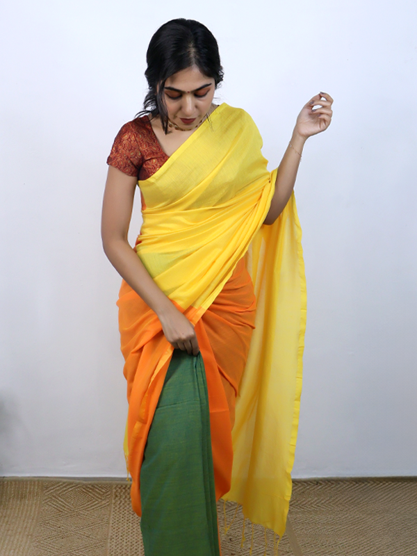 Home Sarees Mul Mul Sthree Yellow, orange & olive green saree